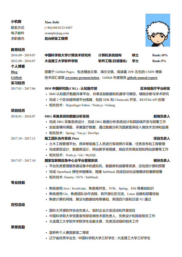 清晰明了的左侧头像设计,教育经历与技能一目了然,适合展示专业技能的IT人才